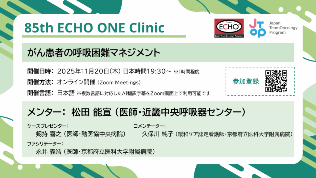 - 本ECHO ONE Clinicは、チームオンコロジー会員を対象とした事前申込制のオンラインカンファレンスです。