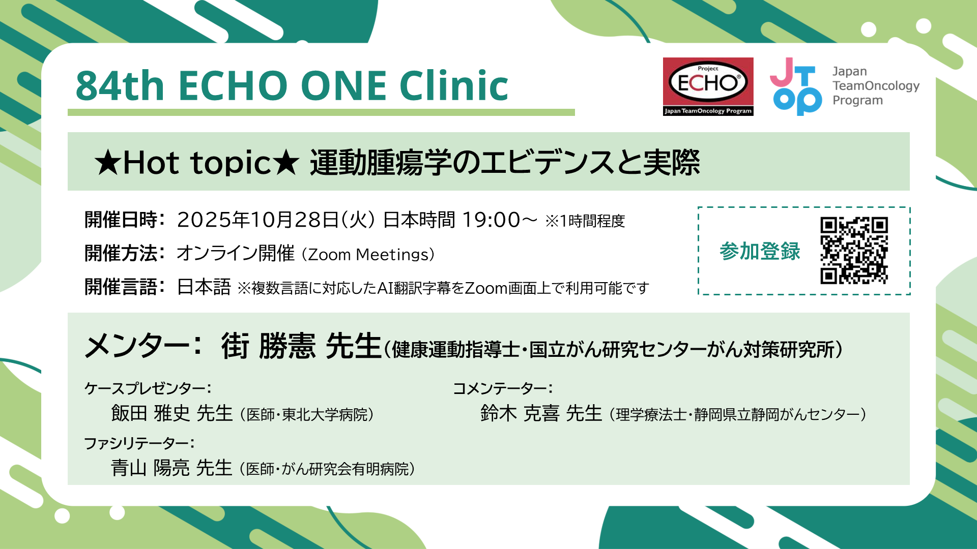 - 本ECHO ONE Clinicは、チームオンコロジー会員を対象とした事前申込制のオンラインカンファレンスです。
