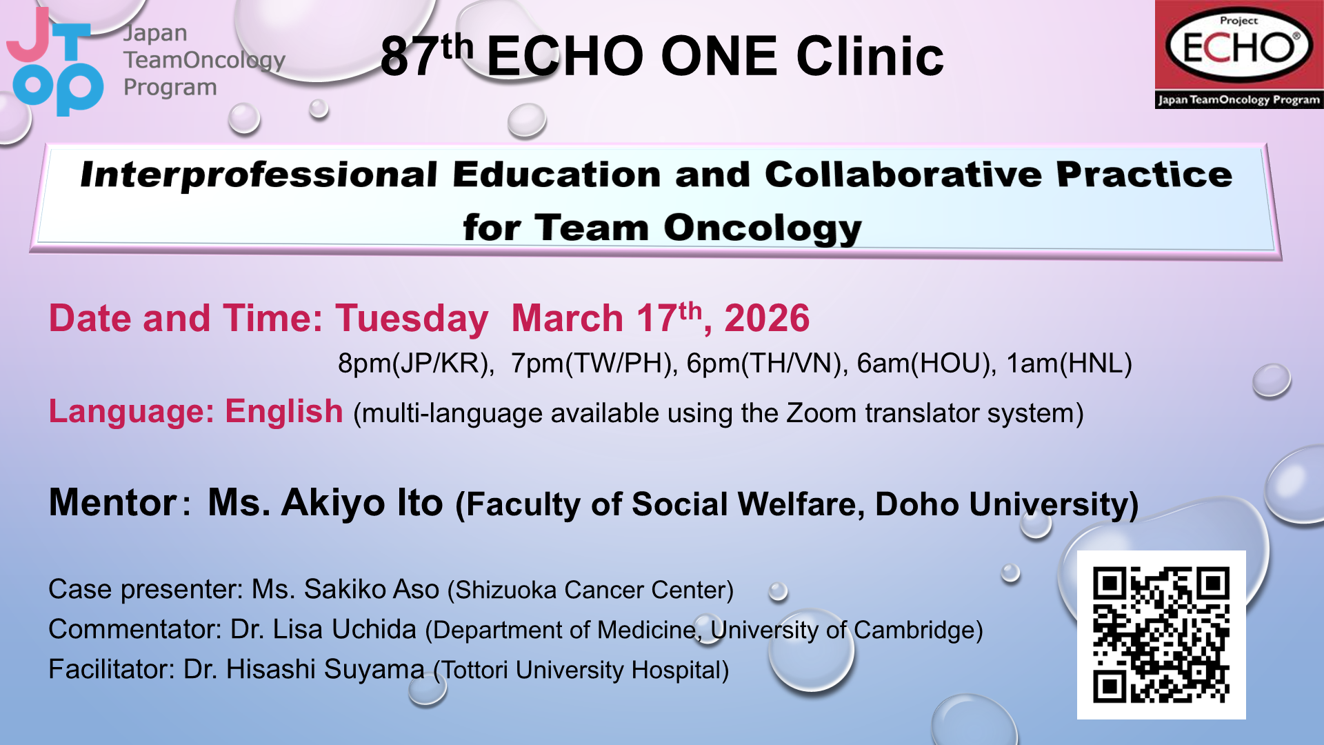 - 本ECHO ONE Clinicは、チームオンコロジー会員を対象とした事前申込制のオンラインカンファレンスです。