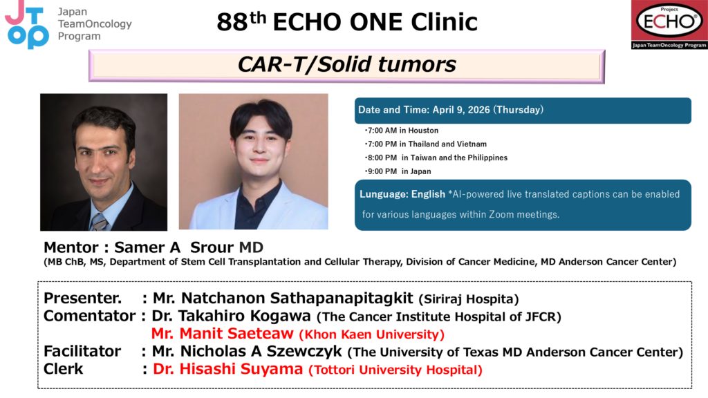 Since January 2019, J-TOP has been an officially designated Project ECHO hub for Asia, a recognition granted by the University of New Mexico (the project’s founding site) with the facilitation of The University of Texas MD Anderson Cancer Center. Operating on the core principles of the ECHO model, we have since developed our “Project ECHO ONE (Oncology Network Education)” program.
